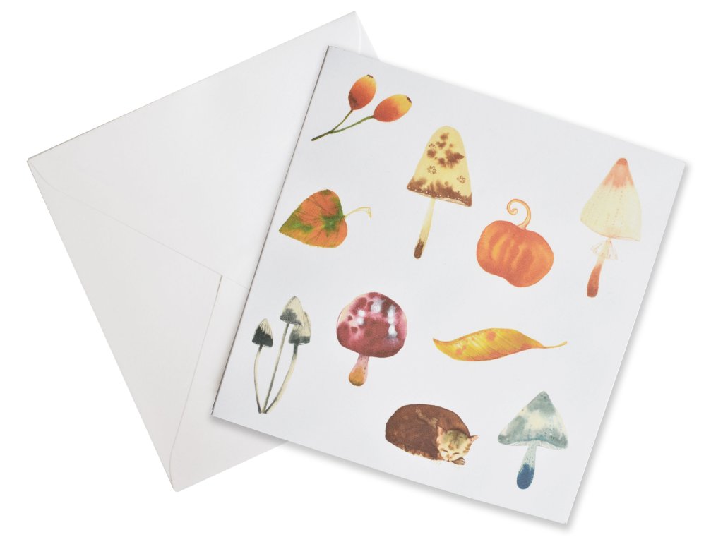 Podzimní blahopřání s obálkou s ilustracemi hub, spící kočičky, šípků a barevného listí.