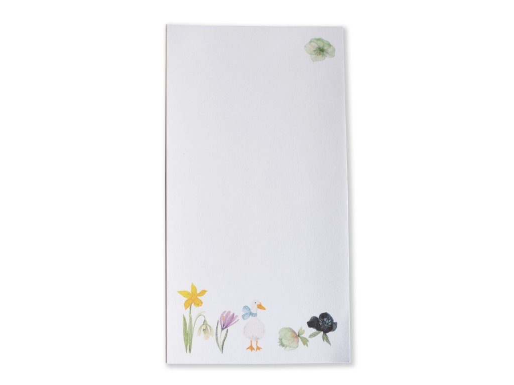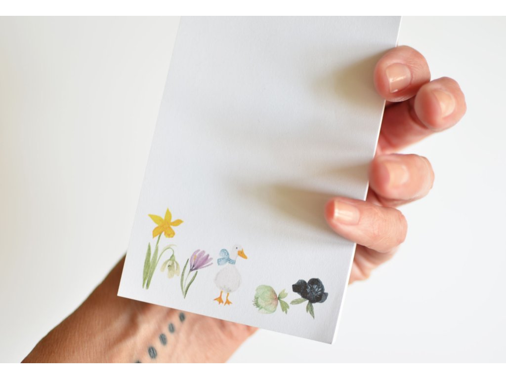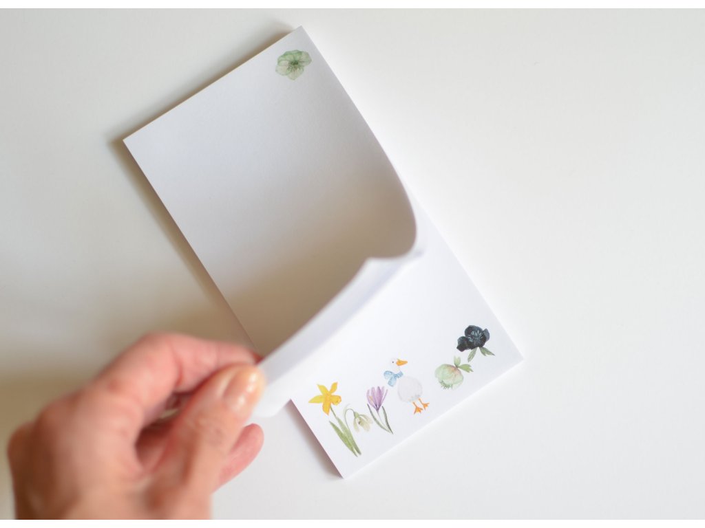 Jarní bloček s husičkou, narciskou, čemeřicemi a dalším jarním kvítím. V ideální velikosti do kabelky a proto těmhle blokům pracovně říkám "kabelkáče". Blok na stůl, do kabelky, do auta, navíc s velmi roztomilým jarním potiskem.