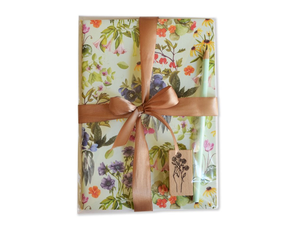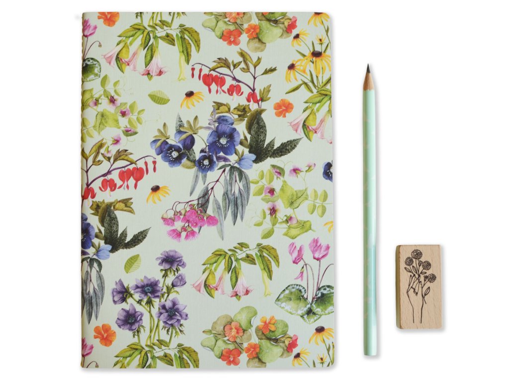 - balíček obsahuje luxusní linkovaný sešit s krásným papírem v barvě slonové kosti, tužku HB, razítko s ručkou a květinou