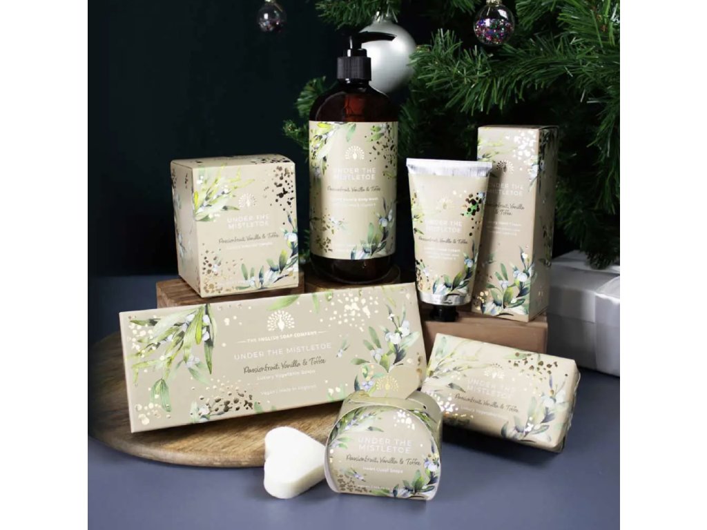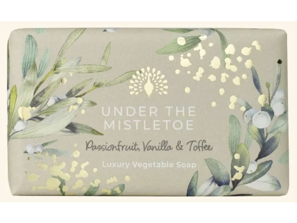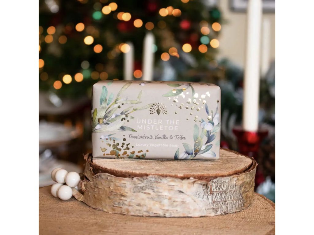 Vánoční mýdlo ve slavnostním balení se zlatými detaily. Mýdlo z dílny English Soap Company sídlící v Sussexu voní po vanilce, ostružinách, mučence a karamelu s tóny mošusu, citronu a mandarinky. Rafinovaná a slavnostní vůně.