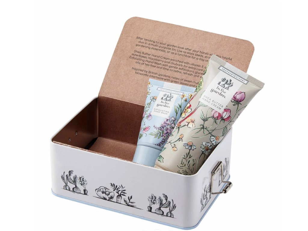 Dárková sada exfoliačního mycího gelu a krému na ruce v nádherné, a hlavně užitečné, kovové krabičce s květinami, kterou můžete dál používat. Duo je ovoněno šeříkem a rebarborou, obohaceno je o extrakt z bezového květu, ostružiny a rebarbory. Obsahuje vitamín E a bambucké máslo.