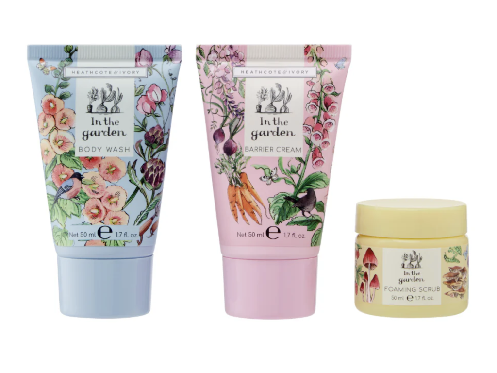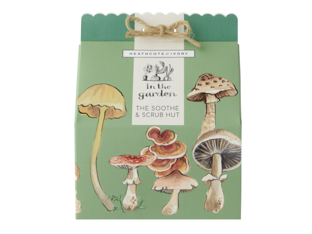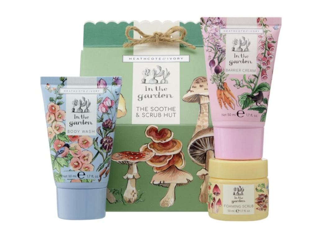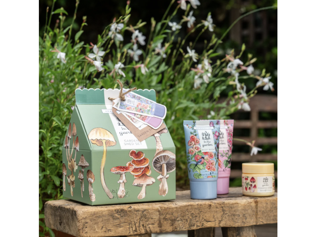Hravá houbičková dárková sada In the Garden s roztomilými ilustracemi voní po rebarboře, šeříku a růžích. O ruce se vám postará limetkový a tea tree esenciální oleje, bambucké máslo a vitamín E.