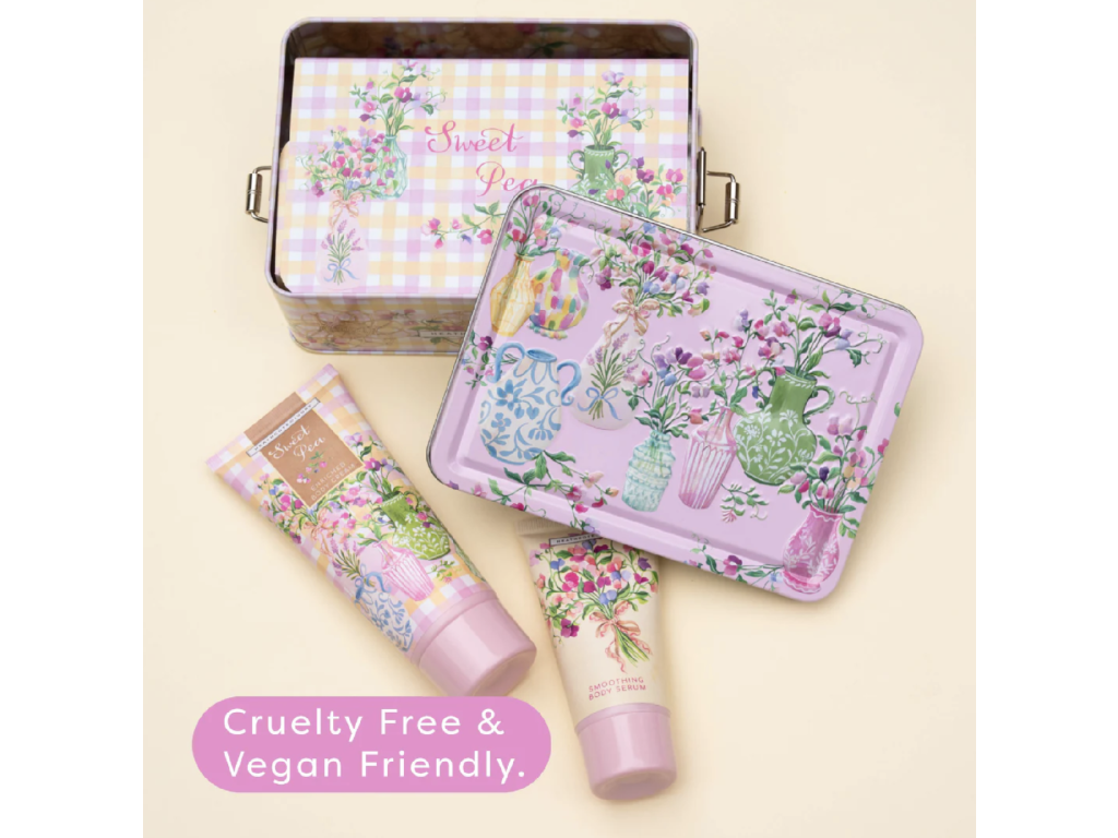 Dárková sada v nádherné plechové krabičce inspirovaná hrachorem s tělovým krémem a tělovým sérem. Obejme vás vůně popínavých rostlin jako je hrachor a zimolez, k tomu se přidá omamný jasmín, gardenie a jemné pižmo. O kůži se postará bambucké máslo, kyselina hyaluronová a extrakt z čekankového kořene.