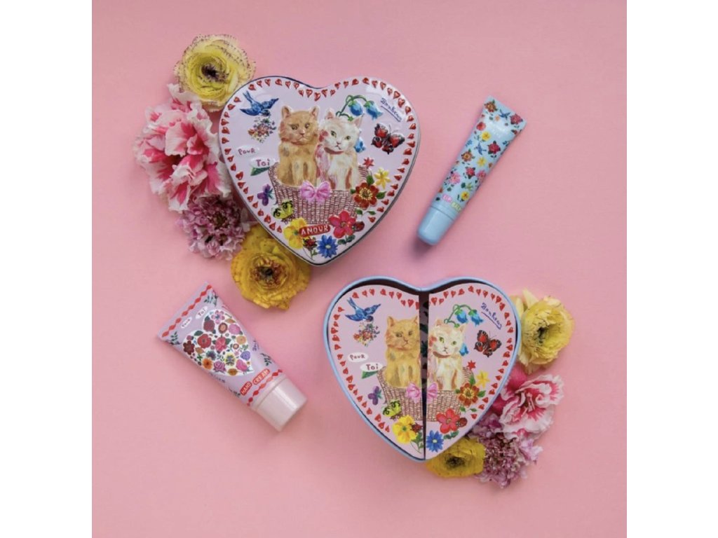 Krém na ruce a balzám na rty v plechové krabičce ve tvaru srdíčka s kočičkami od výtvarnice Nathalie Lété. Nádherná dárková sada ovoní ruce symfonií z růží, santalového dřeva, mandarinky a jasmínu. Krém je obohacený o babucké máslo a vitamín E, jedinečnost a péči dodají výtažky z černého lanýže, chrpy a houby reishi.