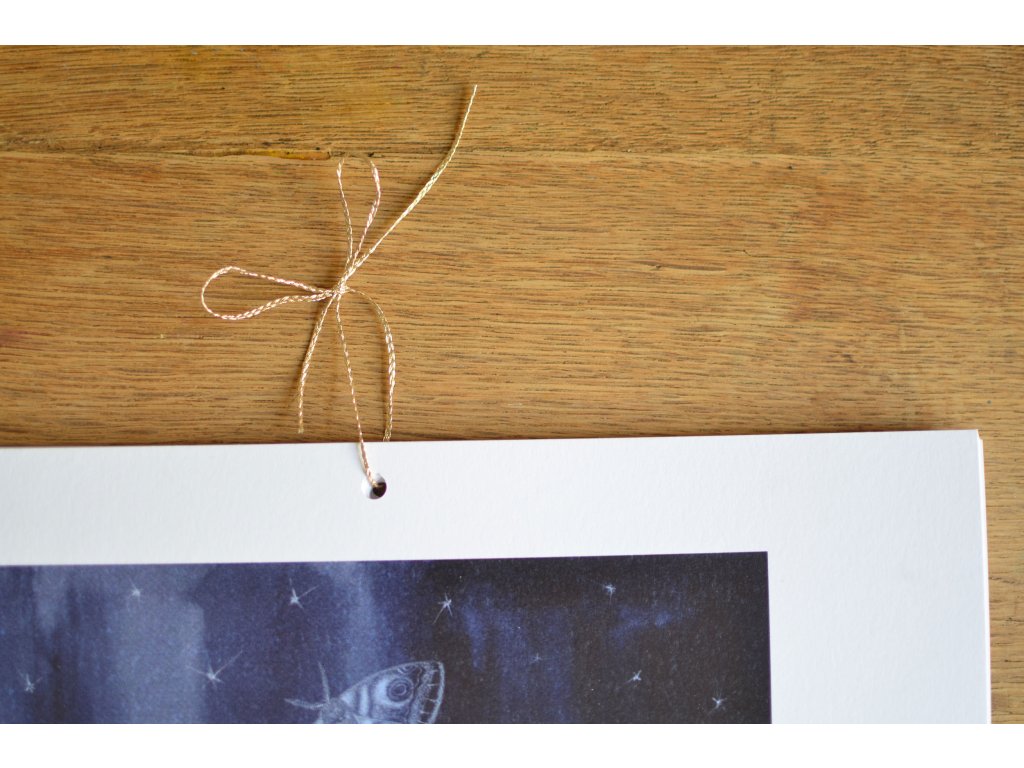 Pro vaše pohodlí jsem letos nezvolila kroužkovou vazbu, ale listy jsou samostatně, abyste nemuseli složitě jednotlivé ilustrace dostávat z kroužků, kde hrozí poškození. Kalendář prostě jednoduše zavěsíte na zlatém provázku na skobičku/hřebík. Provázek bude součástí balení.