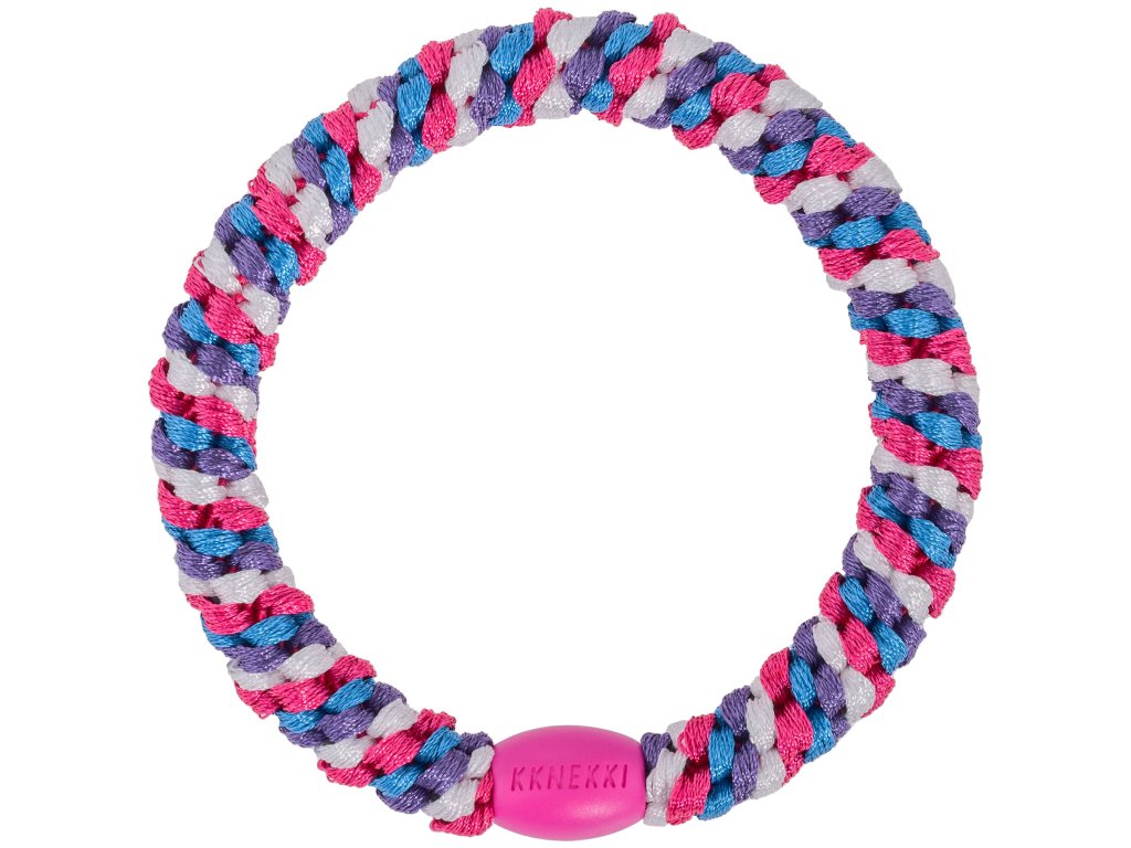 KKNEKKI klasická gumička v odstínech fialové, modré a lomené bílé. Výrazný a veselý kousek. Noste na ruce, ve vlasech, prostě přesně tak, jak to dělají ženy ve Skandinávii, které mají ve svém DNA styl a praktičnost.