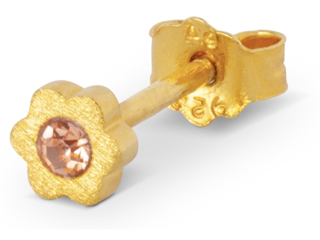 Maličká a velmi krásná jemná kusová náušnice ze stříbra s růžovým zirkonem, pozlacená 18k zlatem. Díky krásnému provedení a decentnosti se hodí pro všechny věkové kategorie. Matný broušený povrch.