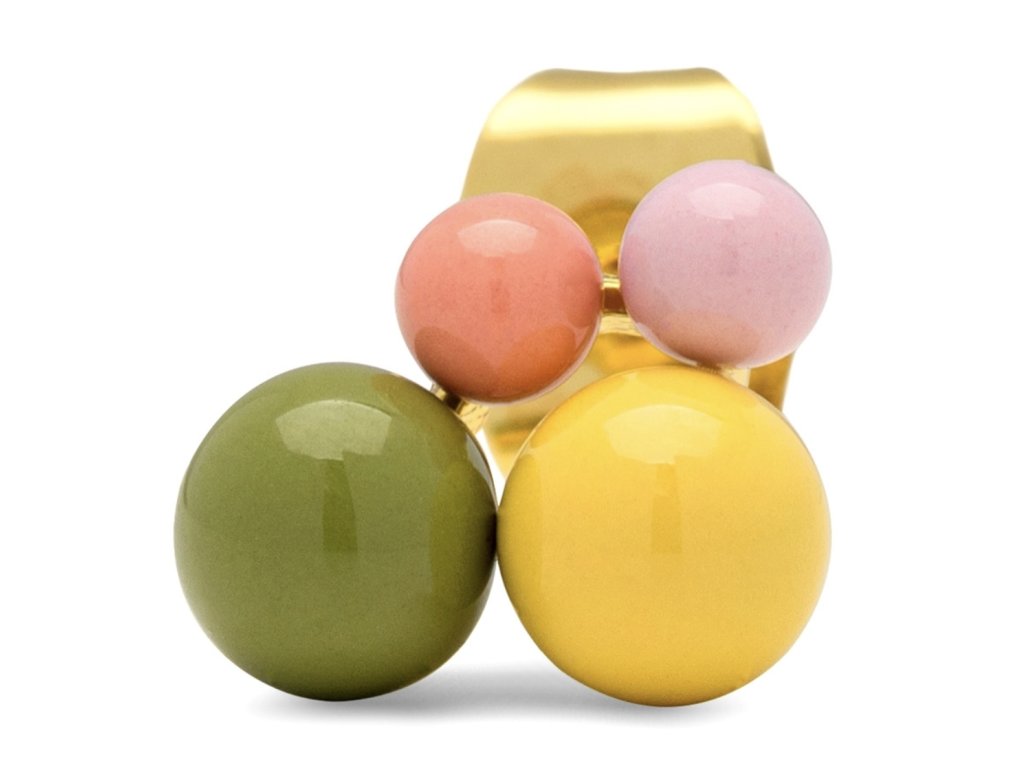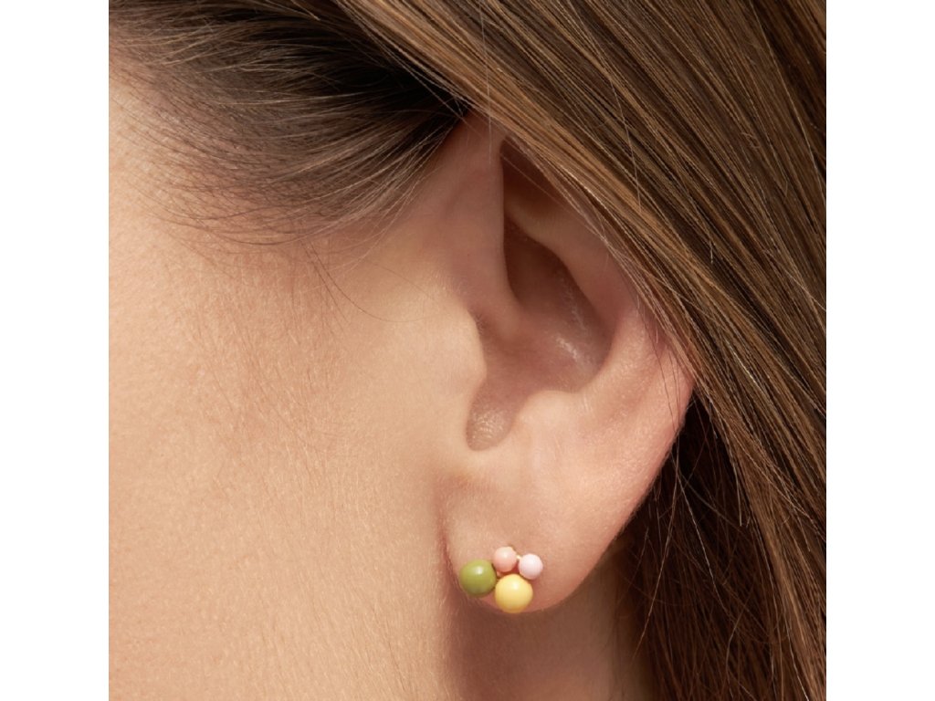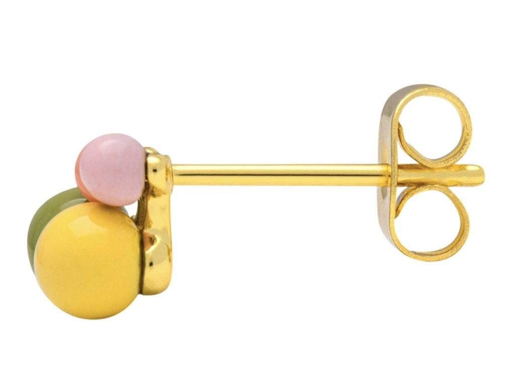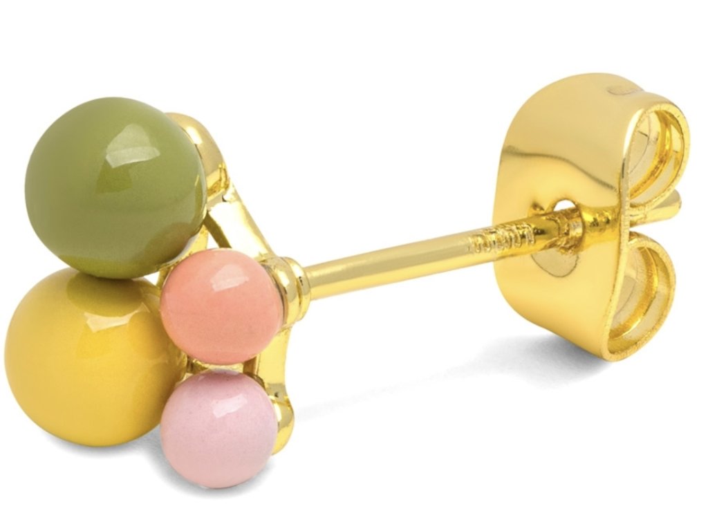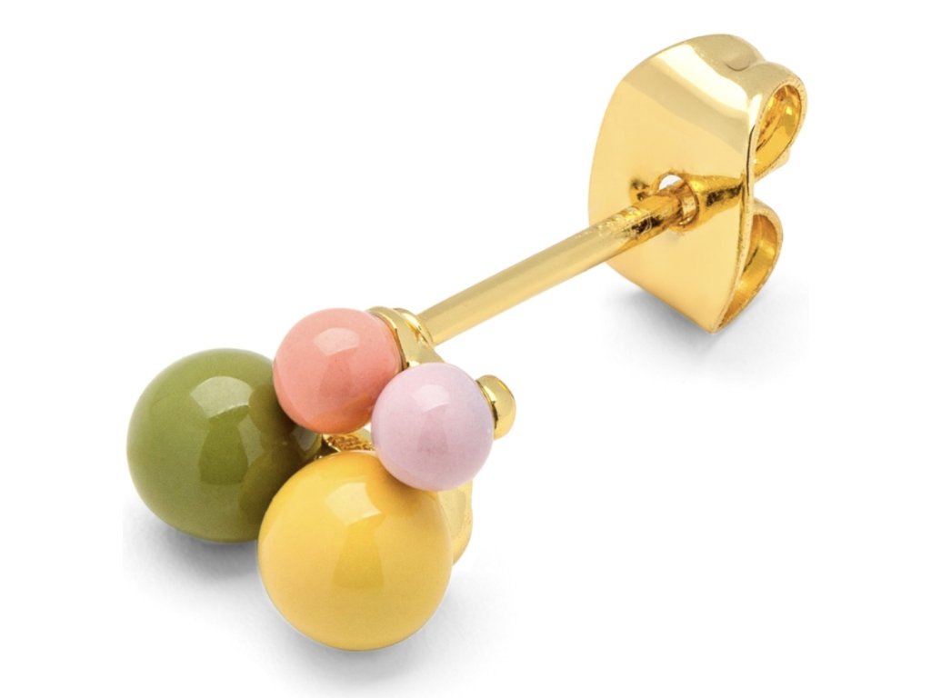Něžná kusová náušnice s ručně smaltovanými kuličkami v různé velikosti. Pozlaceno 18k zlatem. Kombinujte třeba s jinou náušnicí z kolekce Bouquet. Single náušnice jsou perfektní k doladění outfitu, ideální pro více dírek v uchu, kdy si můžete zvolit náušnice podle nálady a příležitosti.