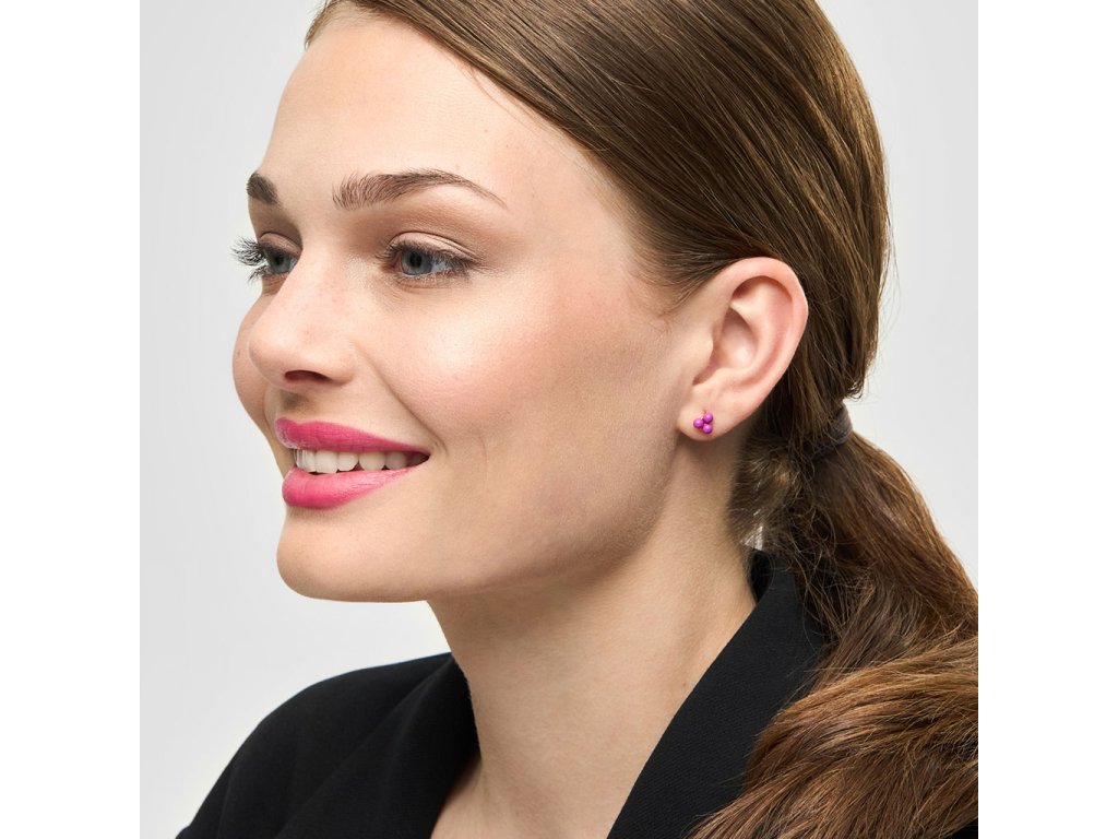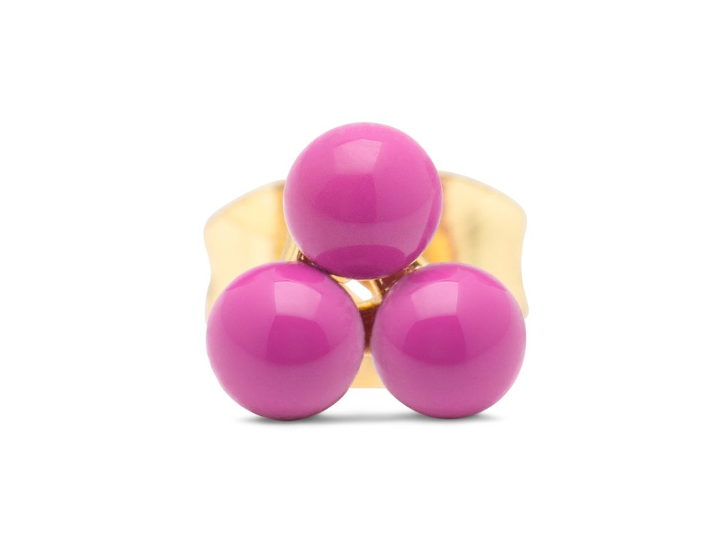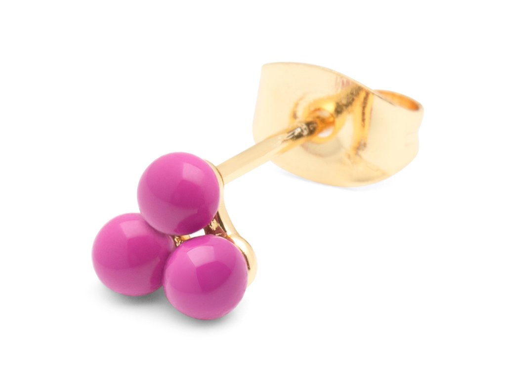 Trojice jemných smaltovaných kuliček v krásné fuchsiové barvě. Pozlaceno 18k zlatem. Single náušnice jsou perfektní k doladění outfitu, ideální pro více dírek v uchu, kdy si můžete nakombinovat náušnice podle nálady a příležitosti.