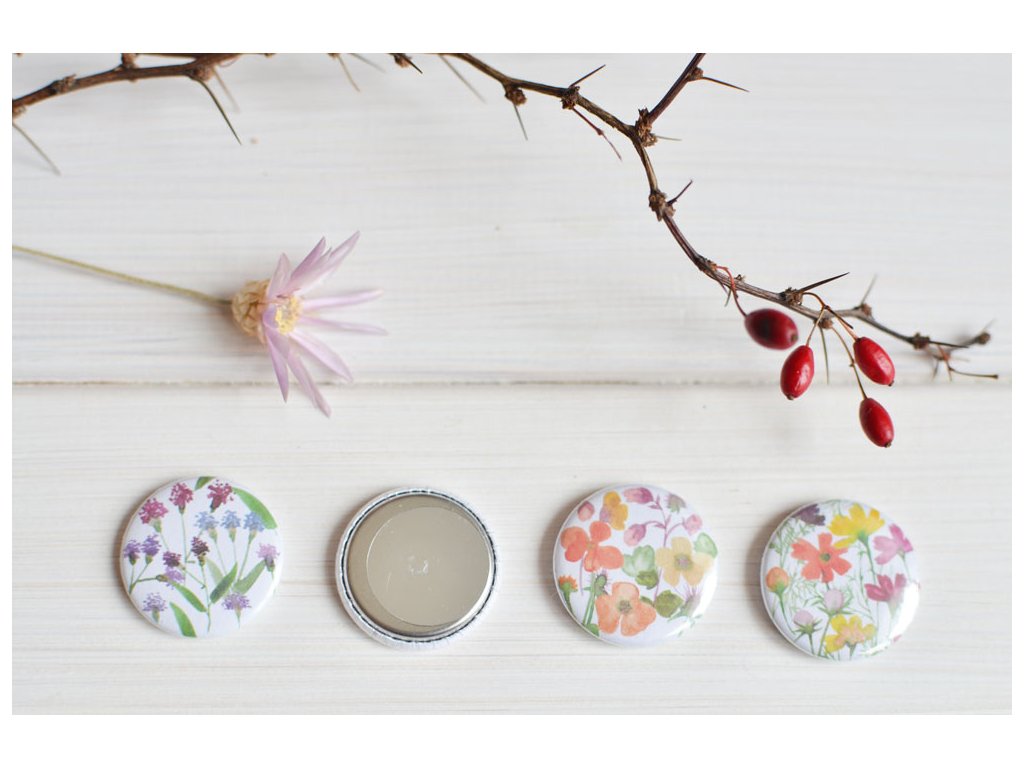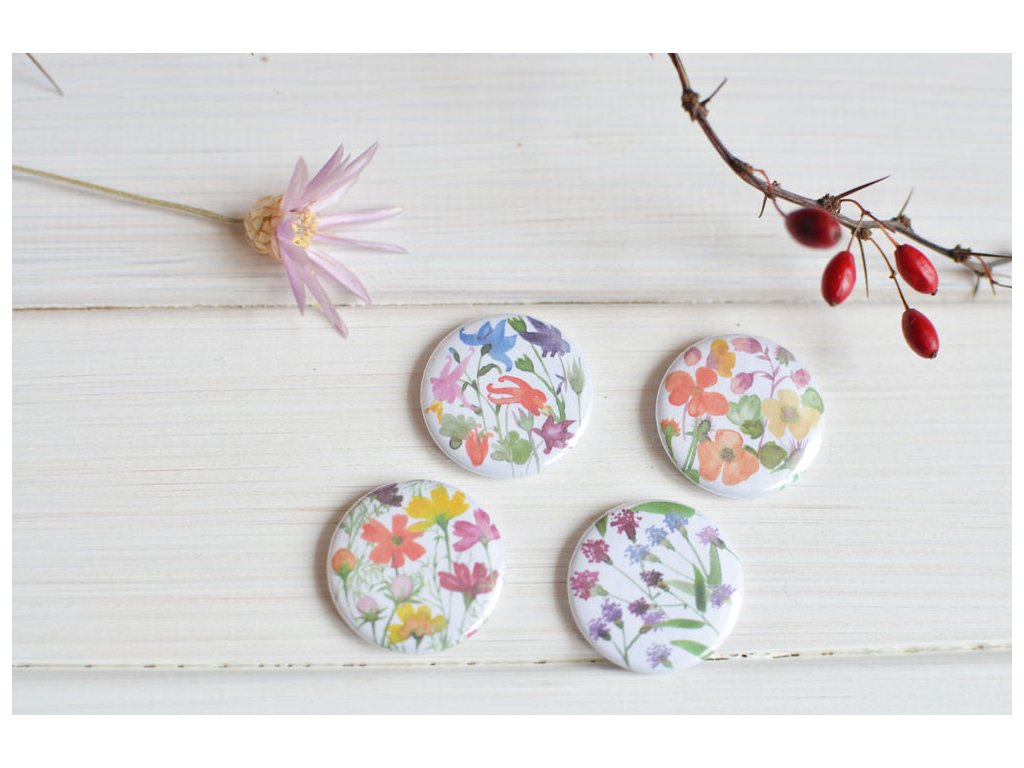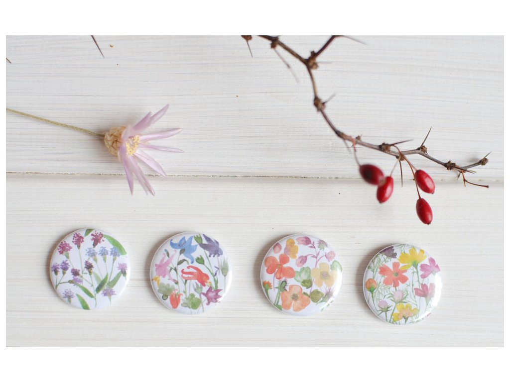 4 pidi kytkaté magnetky s motivy kuklíku, verbeny, orlíčku a krásenek. Květiny, které od jara potkávám po cestě na tramvaj.