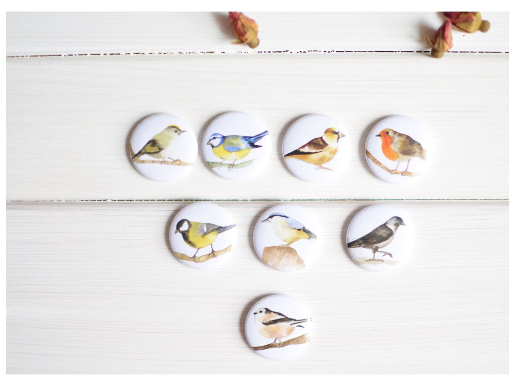 Na magnetkách jsou: kafka, sýkorky, dlask, červenka, brhlík, králíček a mlynařík.