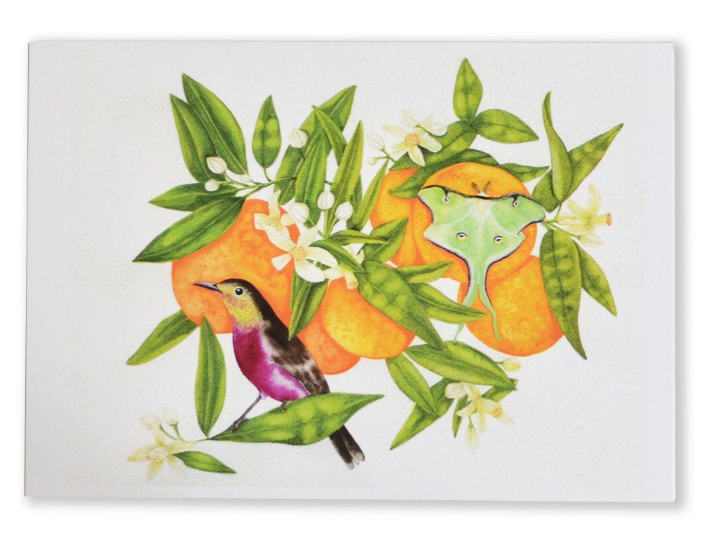 Pohlednice s ptáčkem a pomeranči.