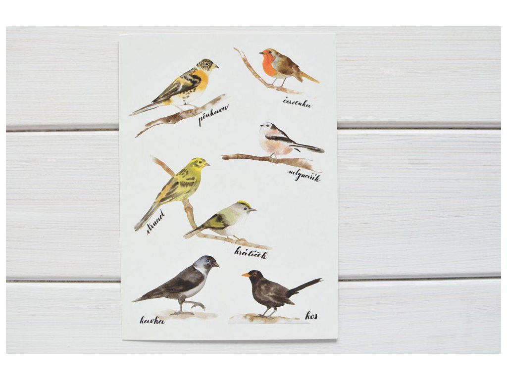 Pohlednice s ptáčky a jejich názvy potěší nejednoho zvídavého a hravého ornitologa.