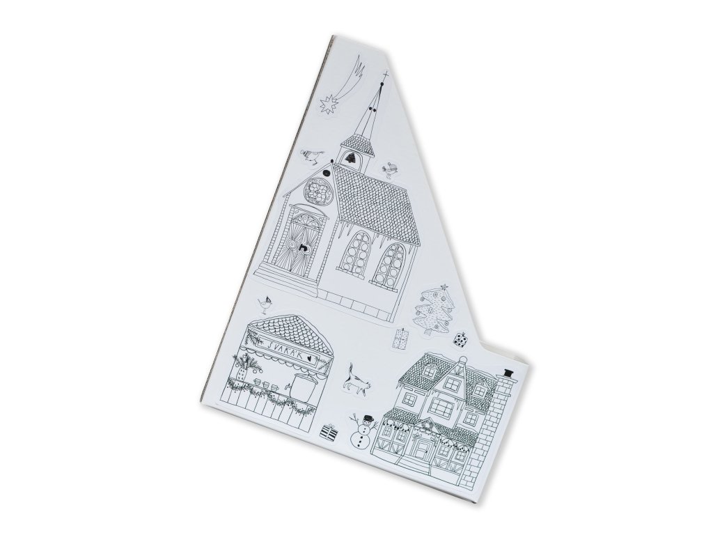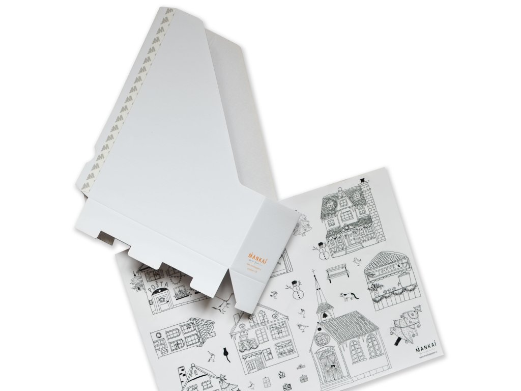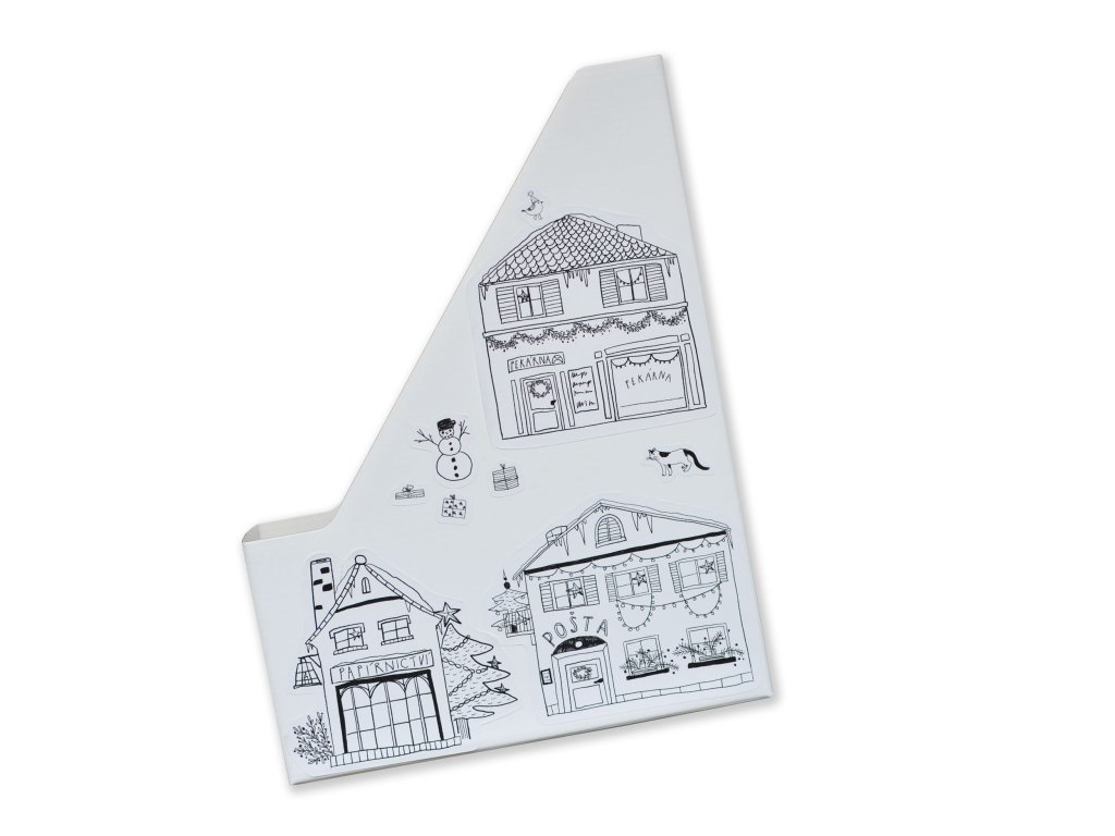 Sada na vánoční tvoření: rozložený nepotištěný pořadač (na zadní straně je pouze logo Mankai) a arch A3 se samolepkami Vánoční městečko na bílém pozadí. Poskládejte si na pořadač svoji vlastní vánoční atmosféru, použijte všechny nebo jen pár samolepek z archu, je to zcela na vás.