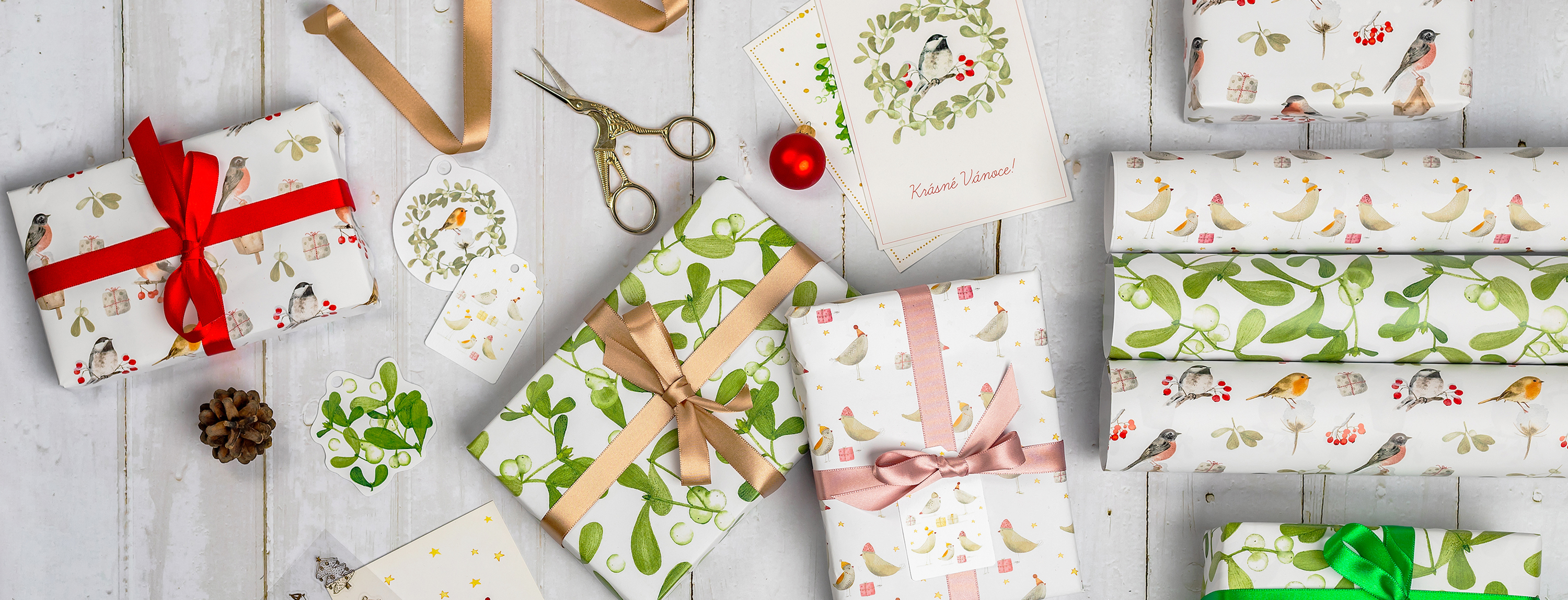 Něžná vánoční kolekce s ptáčky v kulichu. Jemné barvy a klidná atmosféra ručně malovaných obrázků je jako pohlazení.