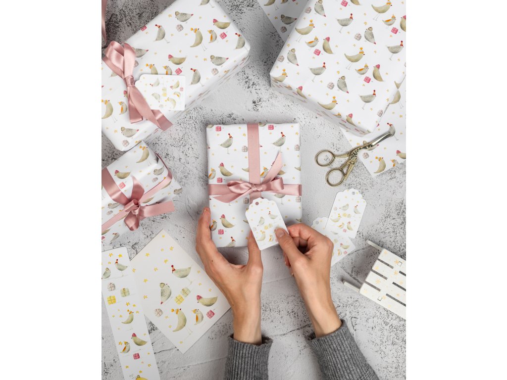 Pět stejných jmenovek na dárky s motivem ptáčků v kulichu na krásném strukturovaném papíru. Cedulky zkombinujte se stejným balicím papírem a výsledek bude dokonalý.
